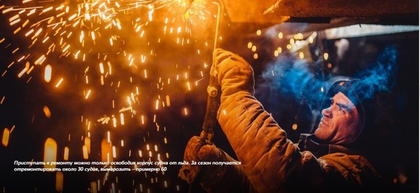 Трескучие якутские морозы — горячая пора для судоверфи на реке Лена. Это одно из немногих мест в нашей стране, где для ремонта применяют технологию выморозки. Под днищем вставших на зимовку судов выпиливают целые лабиринты во льду, чтобы провести сварку или заменить винт.