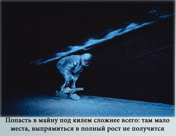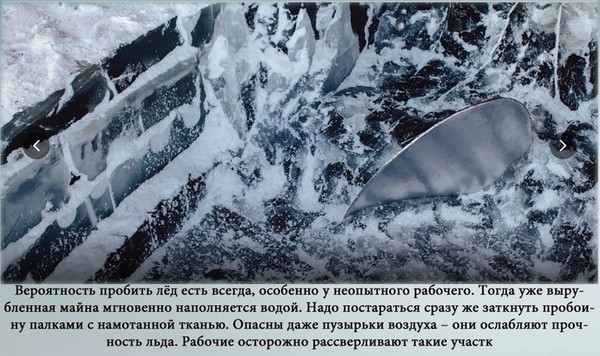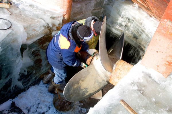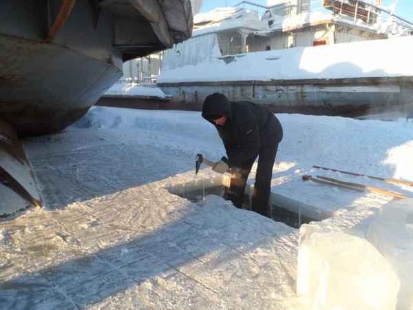 Если очень коротко и просто, выморозчики бензопилой и кайлом срезают верхний слой льда. Ждут, когда заморозится слой ниже, потом срезают его, и так, слой за слоем, заходят под судно к заветным винтам.