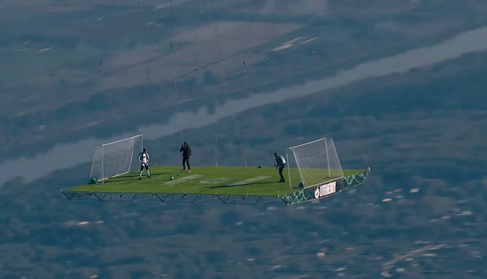 Команда Литвина сконструировала необычную платформу для игры в футбол и закрепила ее на воздушном шаре, подняв конструкцию на высоту около 36 метров над землей. На подготовку и реализацию проекта, по словам Михаила, ушло свыше 30 миллионов рублей. Проект готовился целый год. Нам ним работали около 40 человек. •700 часов монтажных работ • 2517 кг — вес поля, игроков и оборудования • 16×10 м — размер поля • 1,5 часа — продолжительность полёта • 4 раза — платформа собиралась и разбиралась 20 мячей - упало с поля во время матча.