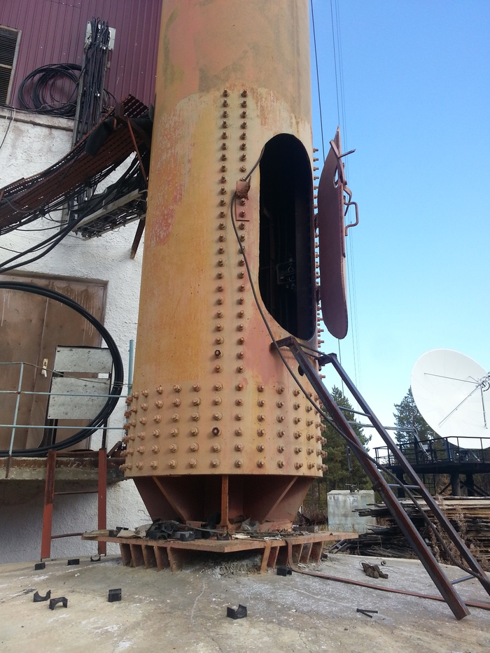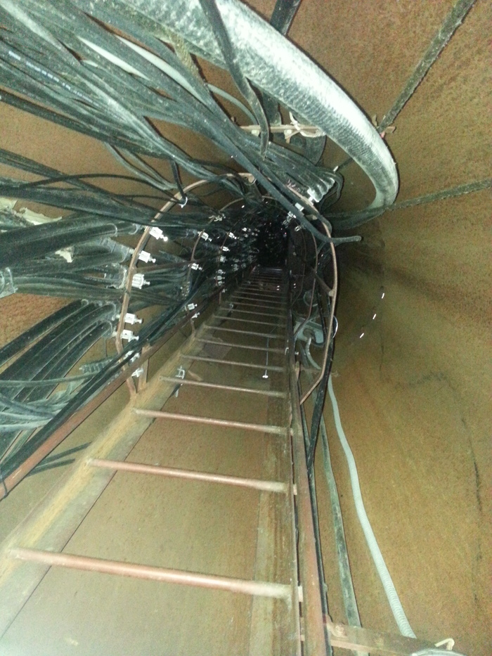 А так выглядят цилиндрические вышки (110 м) изнутри, поднимаешься вверх с инструментами (ключи рожковые навешанные на карабинах и фидер (толстый антенный кабель)) в полной темноте, кажется что она никогда не закончится.