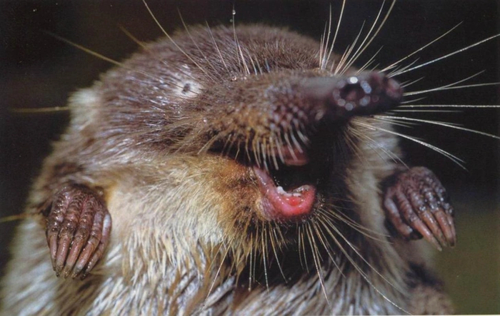 Этот смешной подслеповатый зверь длиной около 20 см и весом всего в 400 г является родственником крота, вот только образ жизни у него не подземный, а полуводный. Под водой выхухоль гребёт, используя большие перепончатые задние лапы как весла, а уплощенный с боков хвост – как руль, и этим достигается высокая маневренность и скорость передвижения. Кстати, хвост её лишён шерсти не просто так – через него выхухоль избавляется от излишков тепла. В жару перегретая кровь попросту отправляется в хвост, где успешно охлаждается.