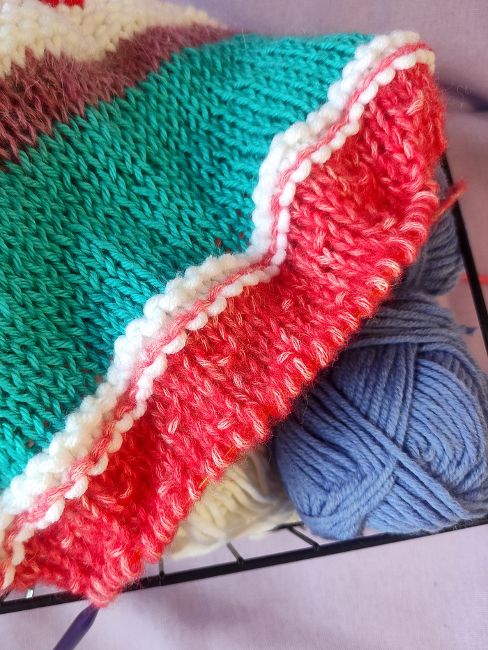 Начало положено, вроде вяжется. И даже быстро! И остановиться не могу. Запускаю руку в корзинку, и достаю контрастный цвет, и давай петельки вязать. Наскучило? Не проблема, достаем другой цвет!)