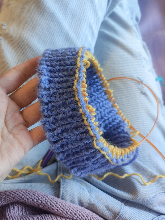 Примерно на этом этапе я решаю примерить на себя, и.. Мне не нравится! Решаю немного распустить, как раз таки до арбузного участка (там, где лицевая гладь жёлтая с серым, очень под грудью приталенно получилось, а потом такой надутый живот, как у беременной. Была бы беременна, оставила бы так, но нет.. Но нет).