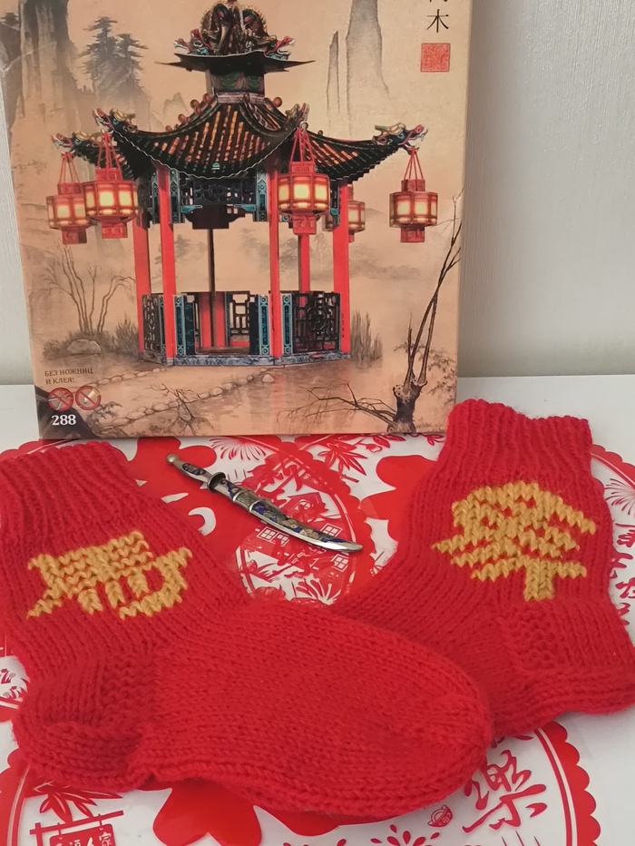 Итак, включаем историческую китайскую дораму (я смотрела "Цао Цао" 2015 года про эпоху Троецарствия), и под неё шустро вяжем пряжей красного цвета носочки. Жёлтой нитью способом "петля в петлю" вышиваем на них иероглифы (красный и золотой - праздничные цвета китайского Нового года).