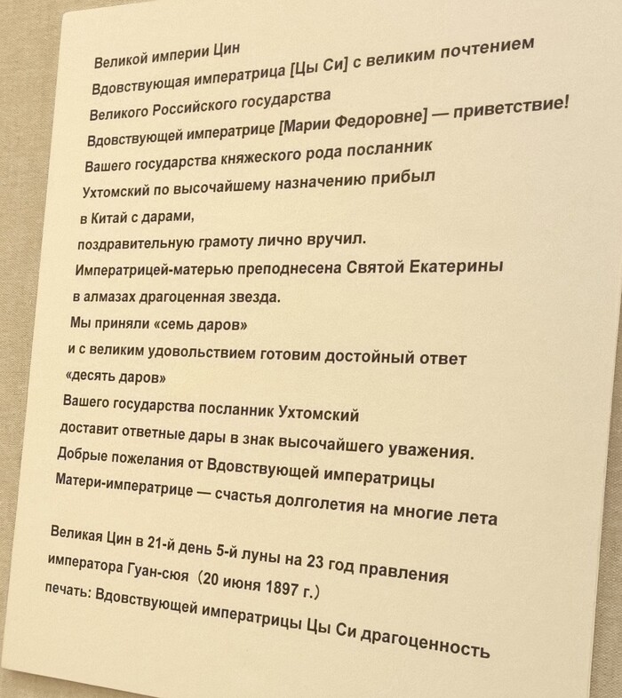 А ещё там были представлены дипломатические подарки, письмо императрицы Цы Си к вдовствующей императрице Марии Федоровне с благодарностью за присланные дары. Как красиво! С каймой из драконов, с красной печатью на золотом фоне.