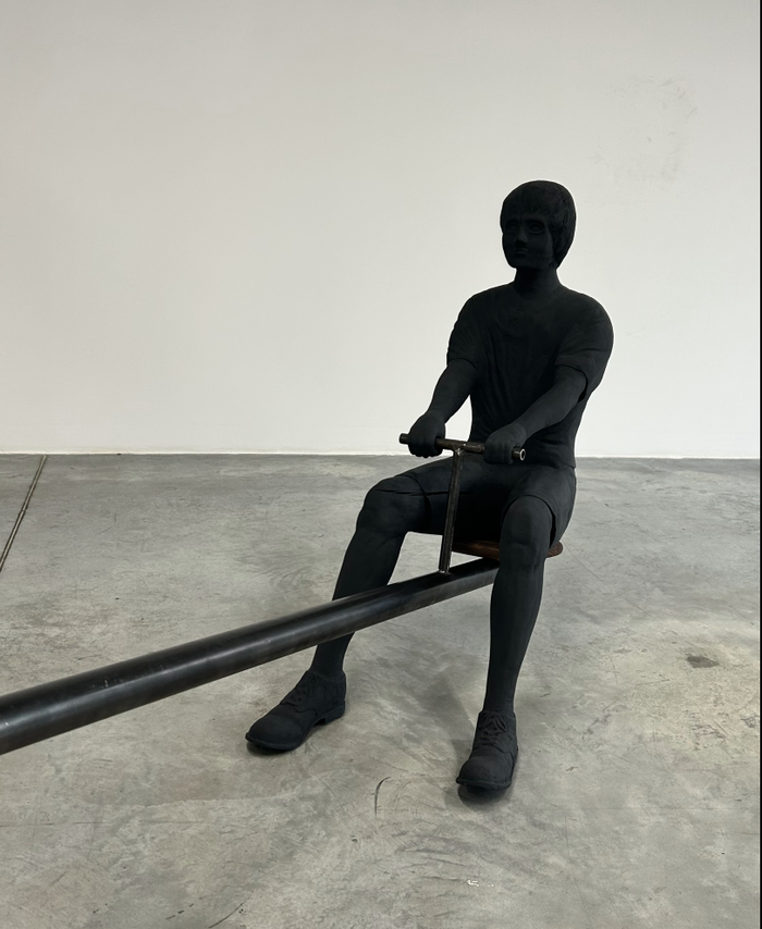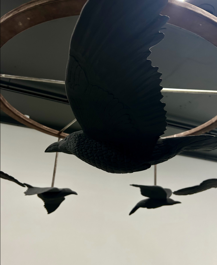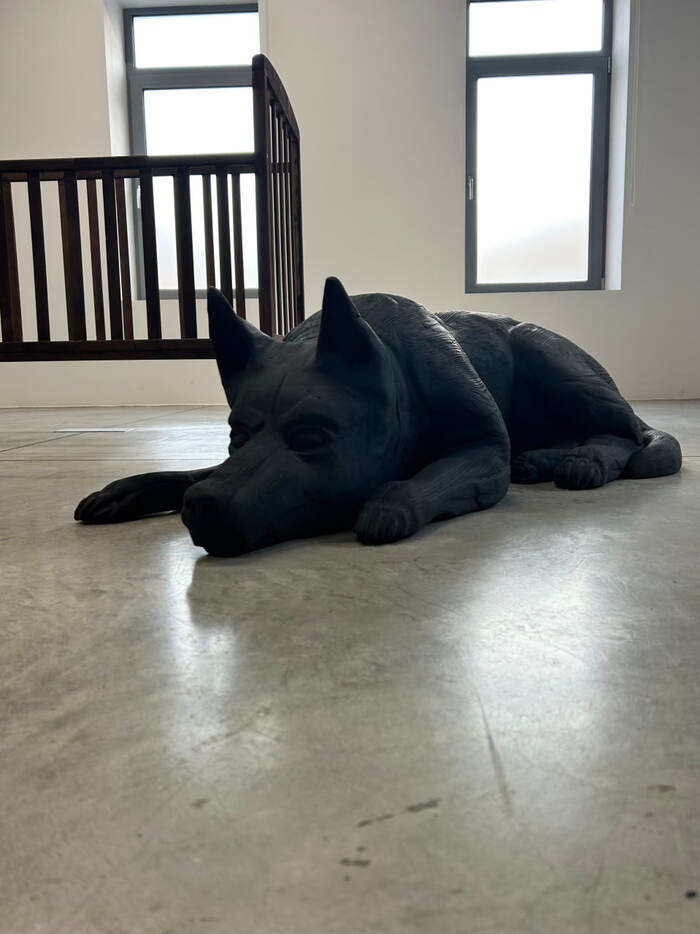 И начать стоит с выставки «Туман» команды Lovemarket, где всего 3 экспоната в пустом светлом пространстве: огромный пес, оберегающий детскую кроватку (в детстве все кажется больше, чем есть), мальчик на качелях в одиночестве, устрашающие птицы в бесконечном кружении — все черные, будто в дымке. Воспоминания? Фантазии? Сон? Тень? Из сосны — подвижного (!) материала, что изменяется всегда и постоянно. Как и они в нашем восприятии.