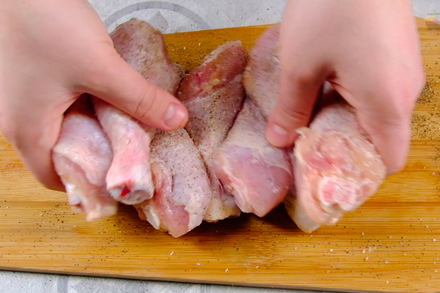 1) Голени промыть, промокнуть салфеткой, затем посолить, поперчить со всех сторон, втирая соль и перец в мясо. Можно использовать любую часть курицы по вкусу или разные части.