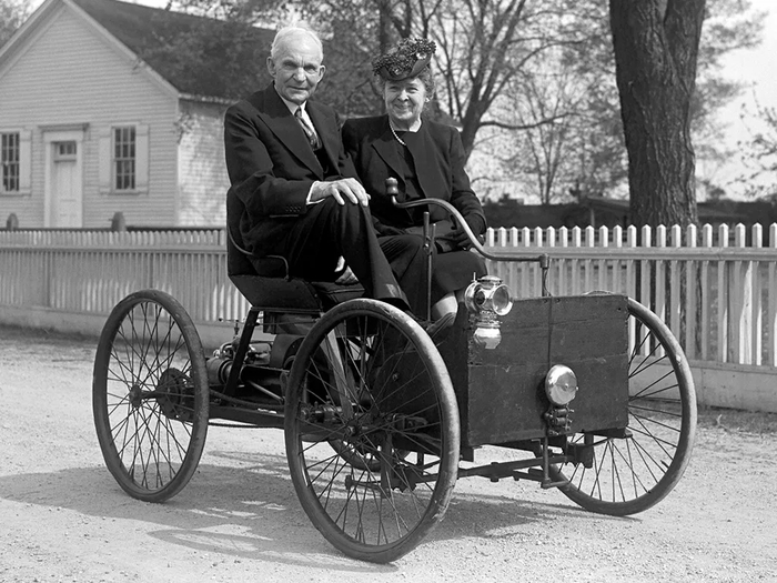 Сарай на заднем дворе превратился в лабораторию по созданию бензинового двигателя. С диким желаем создать что-то своё в свободное от работы время Форд трудился над созданием массового автомобиля. Ииииии в 1893 это удалось! Ford Quadricycle!