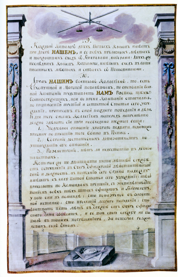 10. Двум Нашим Военным Коллегиям, то есть Сухопутной и Морской повелеваем по окончании военной компании представлять Нам роспись тех военнослужащих, кои во время компании отличились по предписанию третьей и четвертой статьи сего учреждения, прописав в оной каждого поведения и дела. И для того оным Коллегиям наперед непременно должно сделать сии три необходимо нужные вещи:
