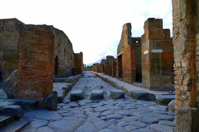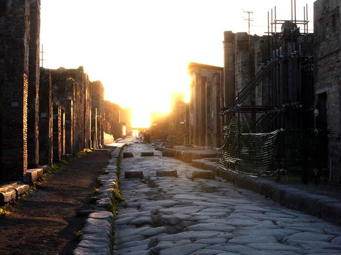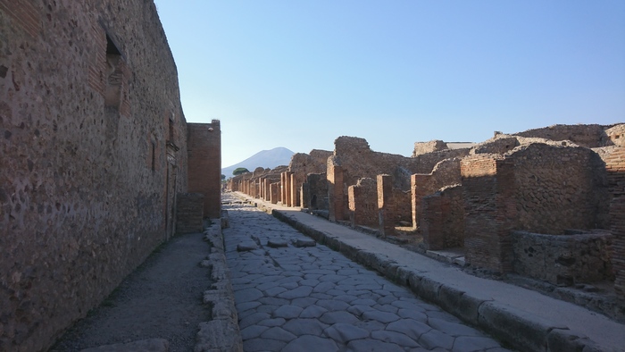 Римский пешеходный переход. Камни на уровне пешеходных тротуаров освобождали пешеходов от необходимости ступать в грязь, намытую водой, и экскременты тягловых животных, коими были усыпаны дороги. Помпеи.