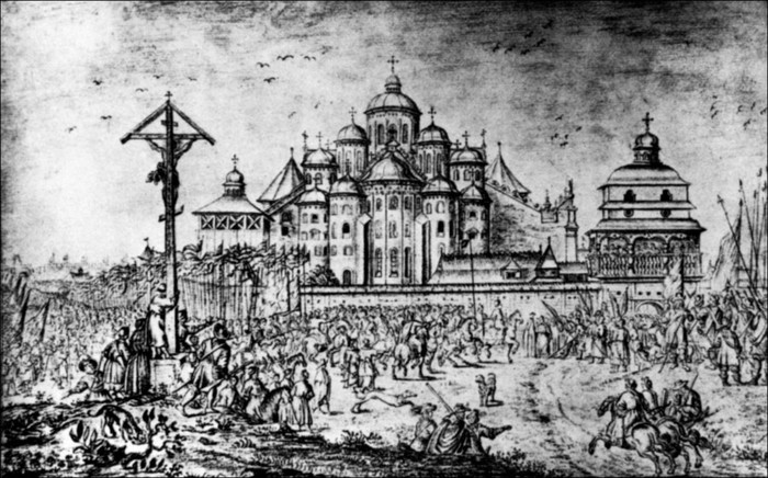 Встреча московского войска и казаков у стен Софийского собора на рисунке Абрахама ван Вестерфельда (1651).