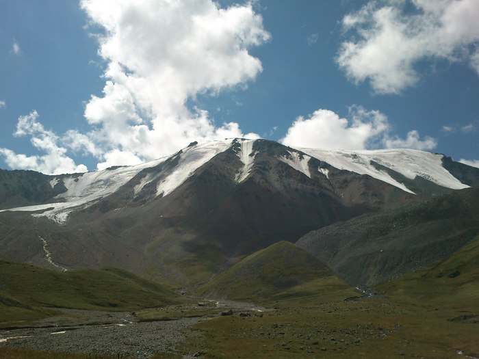 В безумном порыве смелости мы заехали на машине на зеленку на дальнем плане, близко был уже виден ледник, к которому собирались. Но традиции нарушать нельзя - мы засели в грязи, причем под каким-то невероятным креном влево. Приступили к выкапыванию и тут вдруг пришел медведь. То ли у него был отпуск и он решил посетить местные красоты, то ли заблудился (если подобное понятие применимо к животным). Но наш трудовой процесс был прерван и мы быстренько побросали лопаты и загрузились в ГАЗ 66. Медведь, правда, не был настроен агрессивно, скорее ему было любопытно. Ну турист, что с него возмешь. Тем не менее, проверять, в каком медведь настроении мы не стали. Пришлось дожидаться, пока медведь отойдет на приемлемое расстояние. Часа через полтора мы выкопались, под триумфальные крики машина поехала и метров через 10 снова увязла. Все из-за того, что по пути туда мы повредили дерн и он уже нас не держал. Наступили сумерки и в этих сумерках мишка периодически подходил и мы снова прерывали свой скорбный труд. Наконец, когда стало совсем темно мы плюнули на все и ушли в нижний лагерь, в машине остался только водитель Виктор Линкин. Выкопались мы на следующий день, замостив грязь камешками, а мишка уже близко не подходил, наблюдал издалека с приметного камешка.