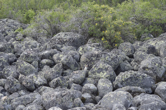 Как бы то ни было, мы тронулись в обратный путь. День выдался неожиданно жарким и почти безоблачным. Памятуя о неудобствах передвижения через ледниковые гривы, мы в этот раз решили спуститься к самому озеру, дескать, там ровнее. Однако, никаких преимуществ это не дало, поскольку вместо бугров и ям мы столкнулись с высоким кустарником, а идти вдоль самого озера было довольно топко. Пару раз нам удавалось найти неплохую траекторию движения по грядам окатанных крупных валунов, выстроившихся цепочками вдоль берега. Однако, каждый раз эти цепочки обрывались и снова приходилось прорубать путь сквозь местный "чаппараль". Добавилась и еще одна проблема- солнце немилосердно палило и мы все потели, как Леонтьев на концерте. А питьевой воды нам не встречалось километров 20- ни ручейка, хотя болотная жижа и чавкала у нас под ногами. Само же озеро с густо засиженными птицами берегами выглядело крайне сомнительно. Лично меня спасало то, что свою арафатку я периодически мочил в каждой болотинке, не заботясь уже у о том, что она стала цвета "исабель", а то и хуже. На 5-6 минут это приносило облегчение. С какого-то момента путь превратился в унылое отследивание по GPS оставшихся километров, поскольку пейзаж оставался одноообразным, а озеро, как всегда, тянулось бесконечно.