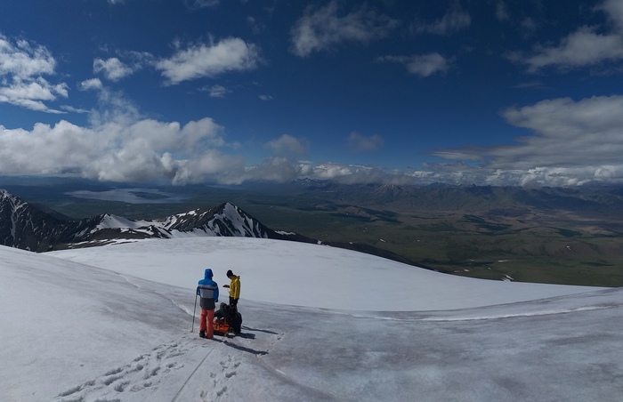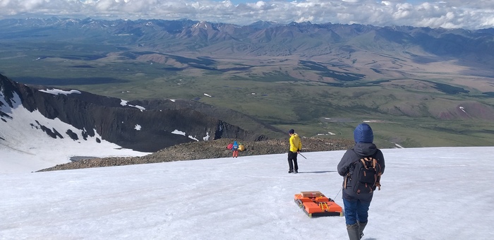 Георадарная съемка (зондирование толщины льда) ледникового купола массива Монгун-Тайга. Западная Тува, высоты от 3650 до 3976 м. Июль 2021 года.