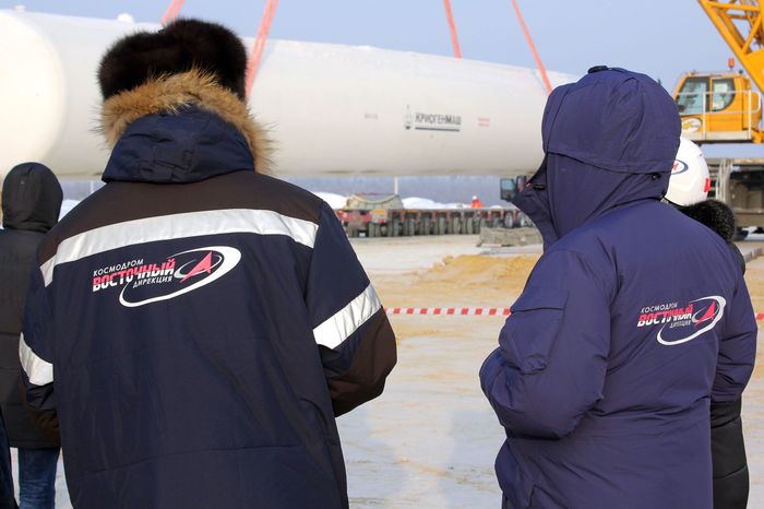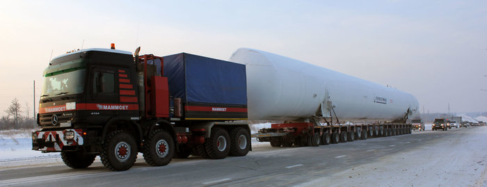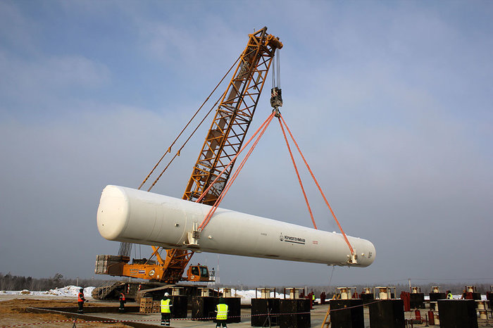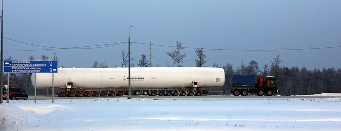 Сами резервуары сначала везут из Балашихи, где находится производство "Криогенмаша". Путь до "Восточного" по железной дороге занимает две-три недели. Затем "цистерну" длиной более 30 метров и весом 92 тонны на минимальной скорости везет к месту установки негабаритный трал. Для этого перекрывают движение - груз не только очень большой, но и очень ценный. Всего же таких емкостей перевезли 9 штук.