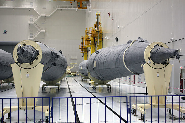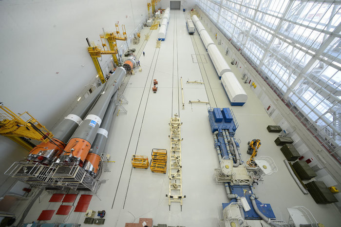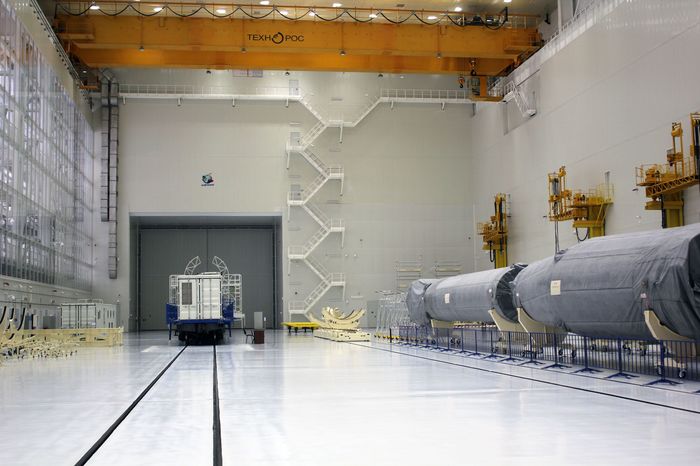 Пока же вокруг стартового стола для "Союзов" тишина - ближайший пуск намечен на апрель. Работа ведется преимущественно в производственных помещениях, где готовят ракеты к старту. Ряд блоков уже дожидается своей очереди в технологическом отсеке.