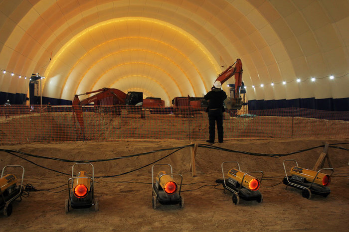 Прямо сейчас возводятся 17 зданий. На месте стартового стола - огромный котлован. А над будущей фундаментной плитой, откуда и будет стартовать ракета, высится пневмоангар размером с футбольное поле. Конструкция способна выдерживать морозы до минус 60 градусов и штормовые ветры до 30 метров в секунду, уверяет Кокшаров. Комфортная температура внутри поддерживается с помощью тепловых пушек, которые позволяют вести работы в круглосуточном режиме. Прямо перед нами экскаваторы вгрызаются в грунт - самая глубокая отметка фундамента расположится на 28 метров ниже уровня земли. Вскоре должно начаться бетонирование.