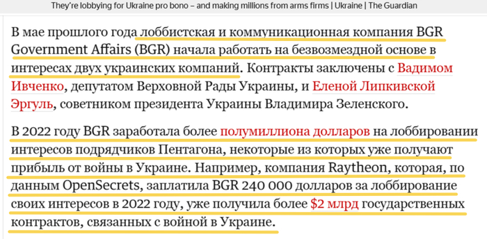 То же самое касается и других военных гигантов США. Действуют американские политики по одному простому принципу: чем активнее идёт война, тем больше денег можно заработать. Саму схему, как это происходит с подрядами конкретно по Украине, приводила британская "Гардиан" на примере концерна Raytheon, производящего "Пэтриоты" и "Хоаки":