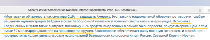 Зачем и почему американцы это делают, вполне доступно объяснил сенатор Роджер Уикер, бывший офицер ВВС США, а также самый высокопоставленный республиканец в сенатском комитете по Вооружённым силам (тот самый, который ещё за 2 месяца до конфликта на Украине предлагал нанести по России превентивный ядерный удар). Вот так он прокомментировал принятие закона о повышении расходов на национальную оборону: