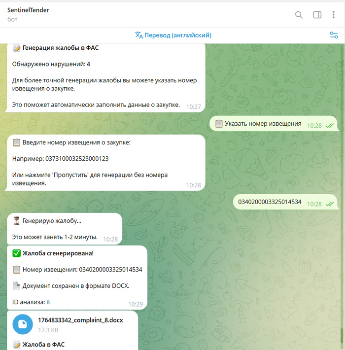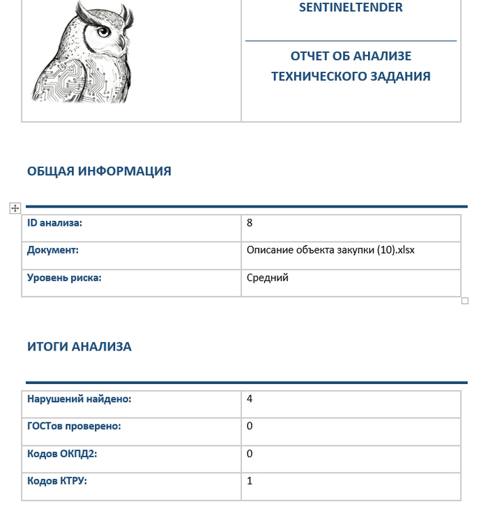 Автоматический анализ ботом SentinelTender за несколько минут выявил четыре ключевых нарушения. Наиболее серьезные из них совпали с теми, что позже легли в основу жалобы участника в ФАС: