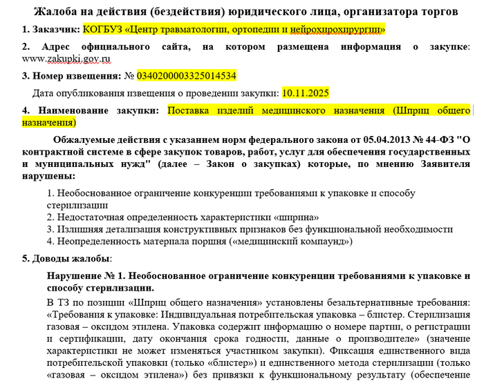 Контекст: 10 ноября 2025 года КОГБУЗ «Центр травматологии, ортопедии и нейрохирохирургии» разместил закупку шприцев общего назначения. Документация казалась стандартной, но содержала скрытые барьеры.
