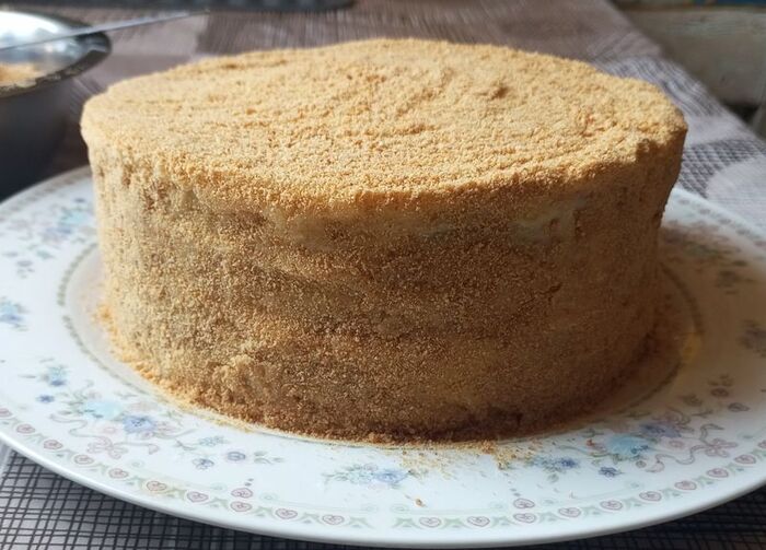 С украшением не морочилась и просто засыпала крошкой из обрезков коржей.