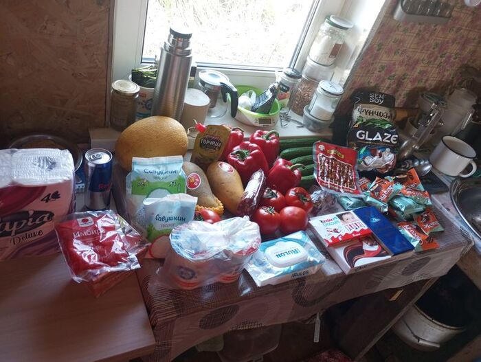 Тут и молоко, и творог, и снежок, и МАНГО, и конфетки, и кексики, и сметана(которая не пережила падения), и хлеба две булки. Никогда не думала что в глухой тайге буду первый раз в жизни кушать манго )