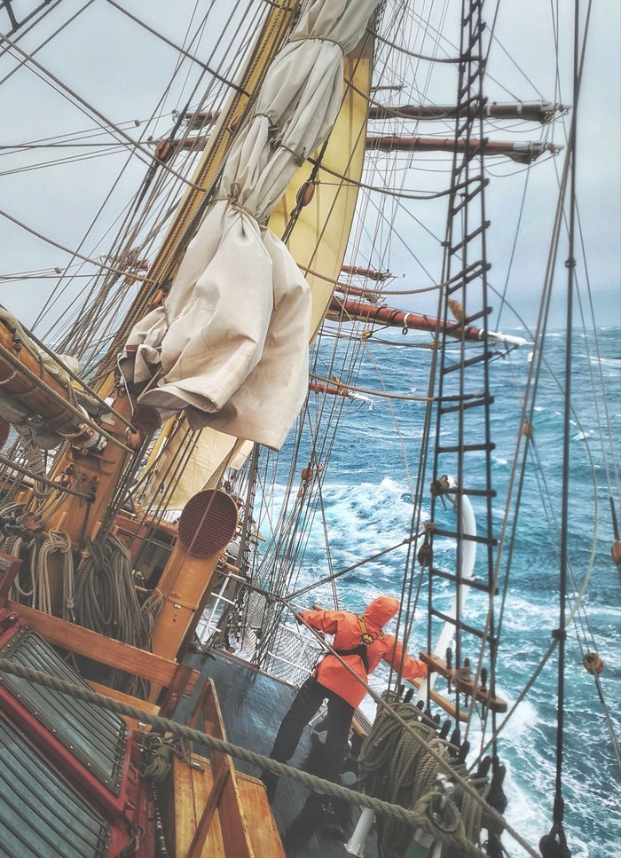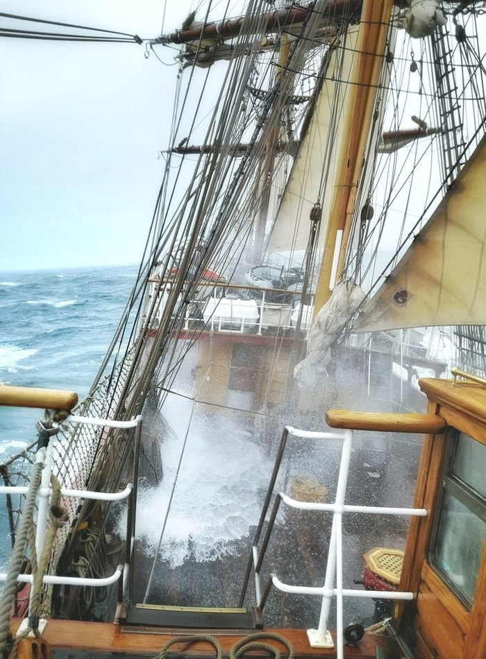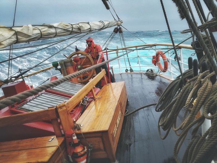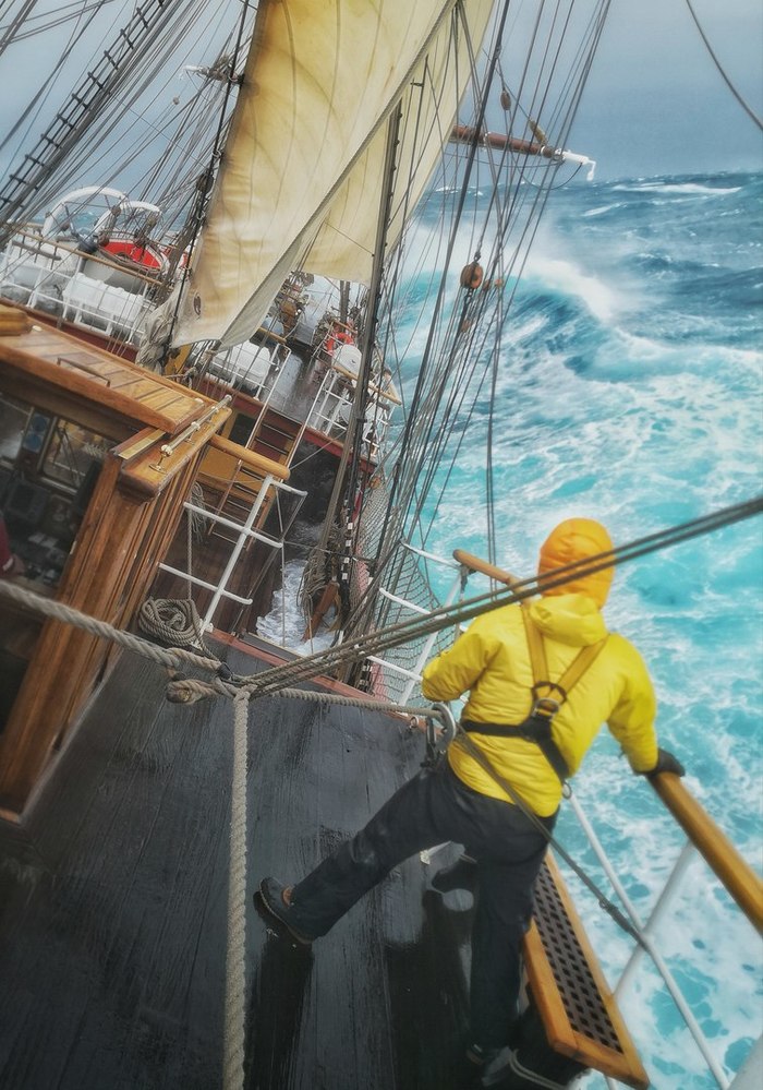 Один из самых запоминающихся моментов нашей экспедиции по Антарктиде - когда мы шли на парусах по проливу Лемэйр. Ветер был сильный, но мы все-таки спустили зодиак и преследовали корабль, фотографируя со стороны.