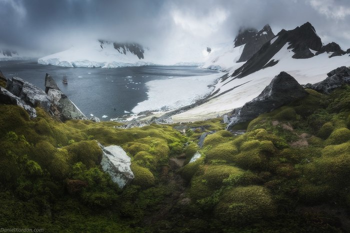 Удивительно, но Антарктида может быть зелёной! Пингвины забираются на самый верх горы, и по пути удобряют склоны. Потом на них растет такой мох. Мы забрались по леднику над гаванью Орни, и тут-то ветер начал меняться, а гавань заносить льдом. Потом были настоящие приключения оттуда выбираться, но это уже другая история...