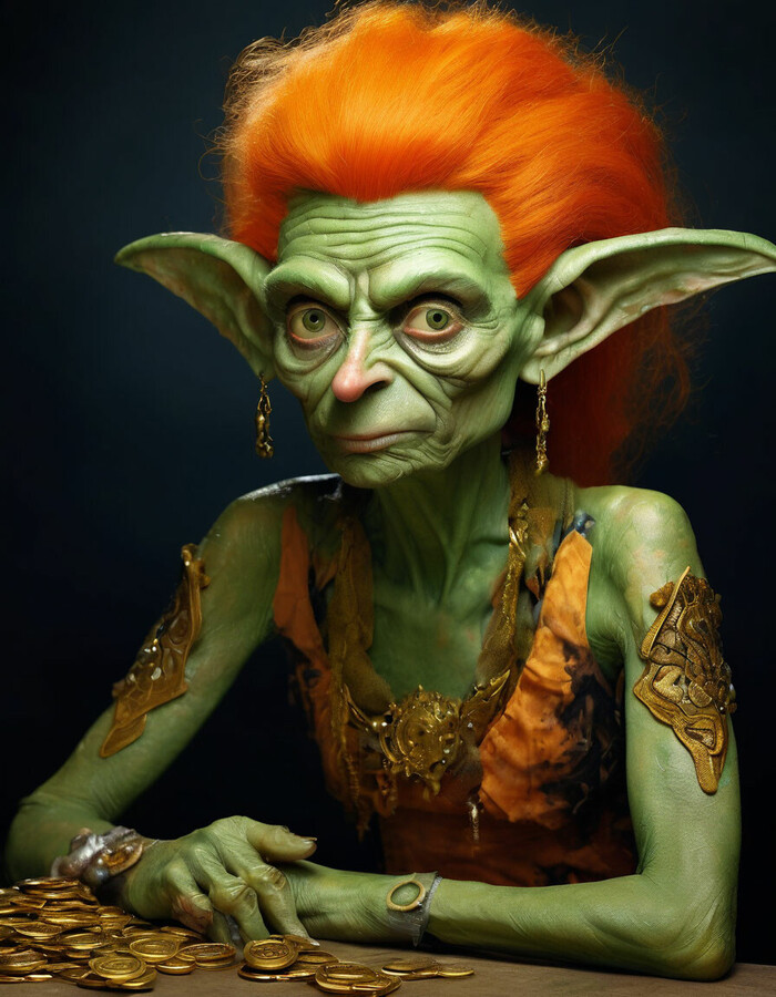 Кусаларикс: прикольная дама-гоблин средних лет, суперфинансист, зелёная кожа, пышная оранжевая замысловатая причёска, острый хищный носик, острый круглый птичий глаз, много золотых дублонов на столе, хищный макияж, хищный маникюр, гиперреализм, компьютерная графика, портрет на фоне гиперпортала
