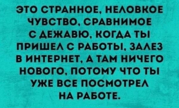 Это странное, неловкое чувство, сравнимое с дежавю, когда ты пришел с работы, залез в интернете, а там ничего нового, потому что ты уже все посмотрел на работе.