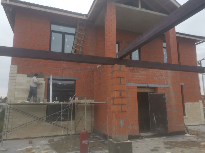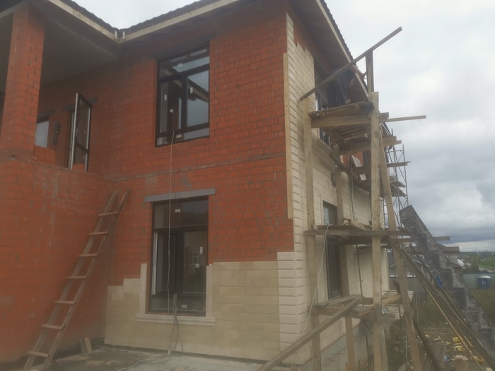 В итоге, закончились оконные карнизы, и самое важное - рустовые камни. Работа встала в лучшем случае на неделю, т.к. этот чудик - распиловщик "не ожидал таких темпов монтажа" и не распилил до сих пор ни одного квадрата.