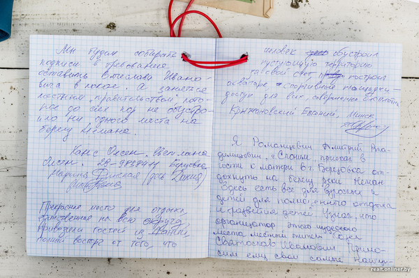 После суда люди подсказали: мол, плохо ты, дед Слава, подготовился. Надо было пройти по деревне, собрать подписи. С тех пор заведена специальная тетрадь. За полтора месяца в ней полсотни записей — от местных жителей, гостей из Лиды, Бреста, Гродно, Минска, Кемерово, Москвы. На каждой странице — благодарности за чудесное место отдыха, адресованные властям просьбы оставить пенсионера в покое. Если в руки судей и чиновников эти записи не попадут, то пусть будут опубликованы хотя бы здесь.