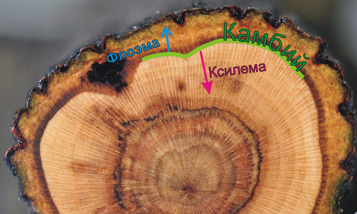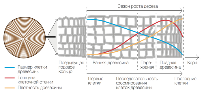 От работы кони дохнут, а камбий только устает! Поэтому по весне растет быстро, делая крупные и светлые клетки — то есть раннюю древесину, а летом — плотные и более тёмные клетки — то есть позднюю древесину. Именно поэтому, темные слои как правило заметно тверже и плотнее.