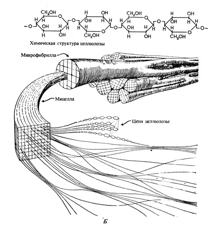 Гемицеллюлозы — ~15–30% Гемицеллюлозы «прилипают» к поверхности целлюлозных микрофибрилл. Их задача связывать микрофибриллы между собой, создавая расстояние между ними, предотвращая слипание. Благодаря этому стенка клетки остаётся одновременно прочной и гибкой.