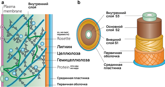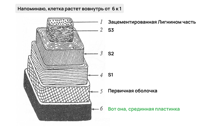 2. При создании клеток ксилема рожает еще и «срединную пластинку». Это не часть клетки, что-то типо клея, чтобы все это не развалилось как буханка от ржавчины сразу после покупки.