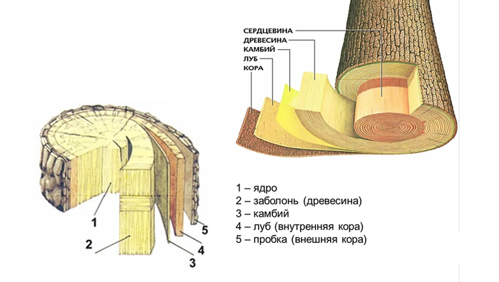 По мере роста дерева, внутренние слои заболони перестают проводить воду и буквально дохнут (даже здоровое дерево состоит из дохлых клеток на вплоть до ~98%). Ядро древесины это «скелет», в нем нет жизни как таковой. Чтобы внутрь не попала всякая борода, вроде грибков, паразитов или гнили, дерево проворачивает фокусы с самобальзамированием, постепенно насыщая старые клетки заболони дубильными компонентами, смолами, фенолами, пигментами и эфирными маслами. Именно они придают ядру цвет, повышенную прочность и делают древесину стойкой к грибкам, насекомым, гниению.