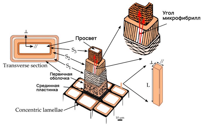 S2 — основной слой – Микрофибриллы располагаются почти вдоль длины клетки. Толщина и угол расположения микрофибрилл напрямую влияет на свойства древесины - прочность, жесткость, усадка и пр.