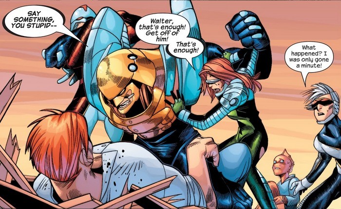 Именно с этого и начнётся сегодняшний пост – с комикса Uncanny X-Men #426 за август 2003 года, с историей от Чака Остена и рисунком от Филипа Тэна. Джаггернаут (Кейн Марко) в Поместье Икс играет в пинбол – и вдруг слышит движняк. Выглядывает в окно, ожидая увидеть свадебную церемонию – а видит кавардак, потому что Лорна Дейн (Полярис) долбанулась на почве того, что Алекс, её жених, слился. Теперь Полярис атакует всех присутствующих своими магнитными силами. Сфокусировано её внимание на медсестре Энни Газиканян, которая в Алекса влюблена. Лорну пытается остановить Ледяной Человек (Бобби Дрейк) – но теряет сознание после того, как Поллярис показывает фокусы с его кровью (в крови же есть железо). Алекс хватает Энни и её сына, Картера, и использует свой энергетический залп для ускоренного побега. Приземление (вернее, приводнение) оказывается не самым приятным, но всяко лучше, чем медленная смерть от переизбытка металлических столовых приборов в теле. Выбравшись из пруда, в который они рухнули, Алекс, Энни и Картер скрываются в лесу, Алекс с помощью Картера заготавливает оружие против Лорны (ветки да палки – металл против неё бесполезен, а в камнях могут быть следы металла), и в процессе признаётся, что влюблён в Энни. Это кажется невозможным, ведь Энни общалась с Алексом только пока тот был в коме – но теперь Алекс знает об Энни всё.