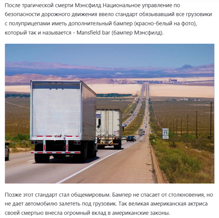 Позже этот стандарт стал общемировым. Бампер не спасает от столкновения, но не дает автомобилю залететь под грузовик. Так великая американская актриса своей смертью внесла огромный вклад в американские законы.