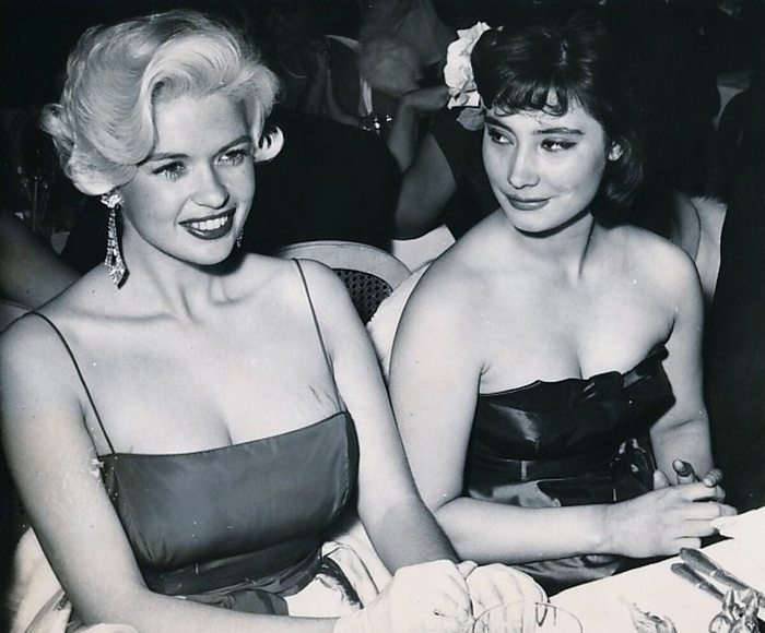 Paramount организовала для меня вечеринку. Все звезды кинематографа были там, это было невероятно. А потом появляется Джейн Мэнсфилд, последняя из пришедших. Для меня это было потрясение … она подошла прямо к моему столику. Она знала, что все смотрят на нее. Села. Посмотри на фотографию. Я смотрю на ее соски, потому что боюсь, что они вот-вот окажутся в моей тарелке. На моем лице виден страх. Я так боюсь, что все в ее платье взорвется – бум! — и разлетится по всему столу.