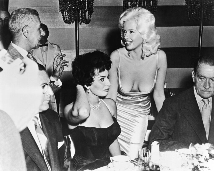 Эта фотография стала мировой сенсацией в 1957 году. Ситуацию на снимке с уверенностью можно назвать одним из самых знаменитых переглядываний знаменитостей: Софи Лорен косо смотрит на глубокое декольте Джейн Мэнсфилд, и выражение ее лица говорит о многом. Рассказываем историю фотографии!