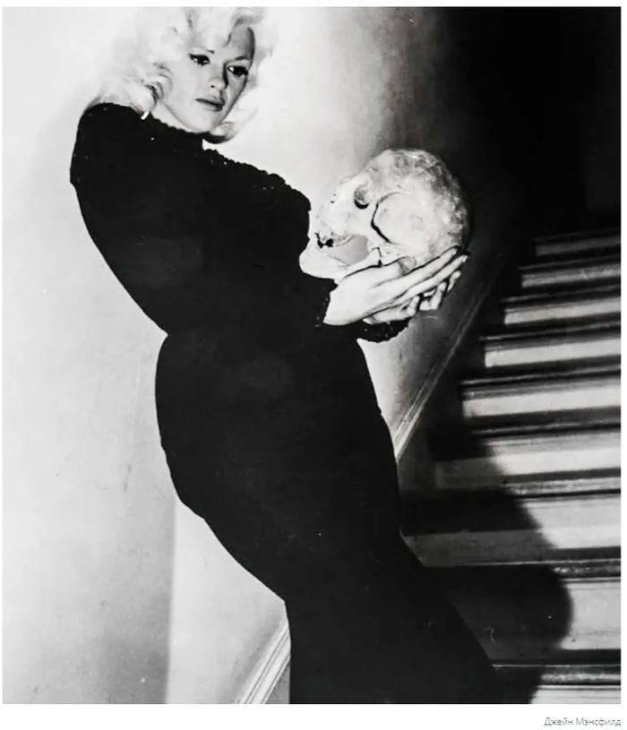 Справка: Ве́ра Дже́йн Мэ́нсфилд (в девичестве Па́лмер). Родилась 19 апреля 1933 года. Американская киноактриса, добившаяся успеха как на Бродвее, так и в Голливуде, неоднократно появлялась на страницах журнала Playboy. Джейн была довольно умна, говорила на пяти языках и имела классическое музыкальное образование по классу скрипки и фортепьяно, однако прекрасно понимала, что ее IQ интересует публику куда меньше, чем восхитительные параметры: 102*54*91. Актриса четырежды выходила замуж, всерьез увлекалась сатанизмом, много пила. 29 июня 1967 года Бьюик Мэнсфилд на большой скорости врезался в заднюю часть тягача с прицепом, который притормозил за грузовиком, распыляющим противомоскитный дым. Трое взрослых на переднем сиденье погибли мгновенно. Дети Мэнсфилд, спавшие на заднем сиденье, выжили и получили незначительные травмы. (Вики+Кино.Мейл.Ру)