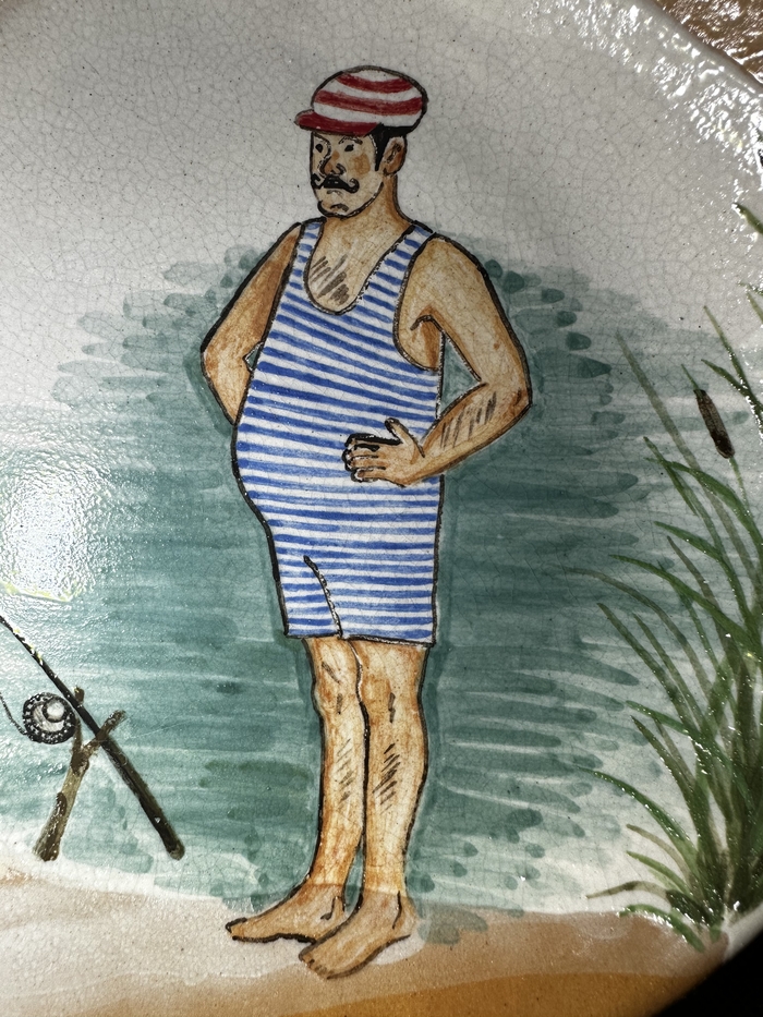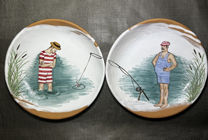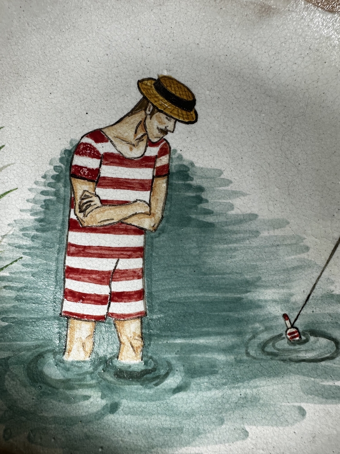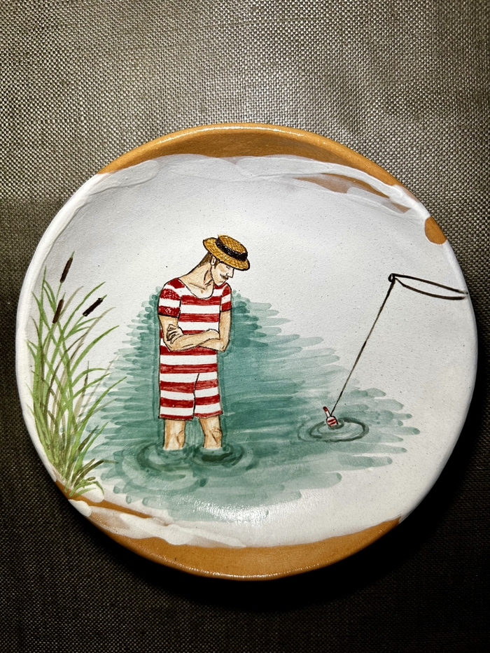 Слепилась однажды у меня керамическая тарелка, из глины светло-терракотового оттенка. Вначале думала белыми ромашками её расписать, но потом открывая баночку, разлила белый ангоб лужей прямо на тарелку. И так похоже стало на речку с песчаными берегами что кисточки полетели наперегонки с мыслями.
