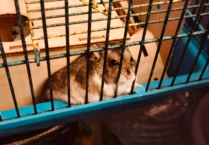 Итак, 27 марта 2024 года в 6 утра Хомячиха вылезла из вентиляции в туалет в нашей квартире, чем напугала мою супругу, которая в тот момент собиралась на работу. Хомячиха была отловлена и опознана как джунгарский хомяк. В течение ближайших суток на призыв в местные вацапы никто не откликнулся, поэтому Хомячиха обзавелась клеткой с колесом, поилкой, домиком и миской, наполненной недешевым кормом. И стала нашим домашним питомцем. На совете с супругой мы назвали её просто - Хомячиха. Потому что самка. По ходу дела придумались ещё несколько шутливых кличек, вроде "Сопля", "Малявка", "Маленькая", "Мягкий Камешек".