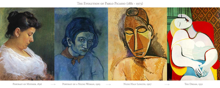 Возьмем например Пикассо. Ранние работы академичны. Второй этап — ближе к экспрессионизму (как раз это течение набирает обороты в 1900х).