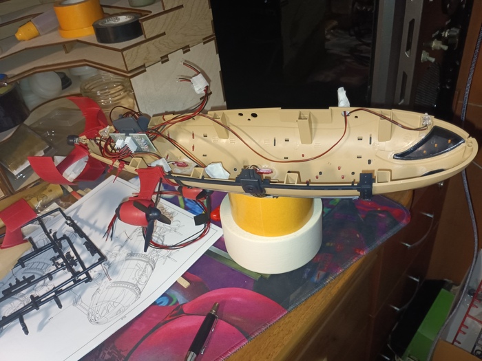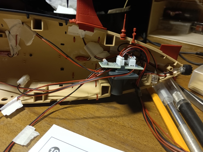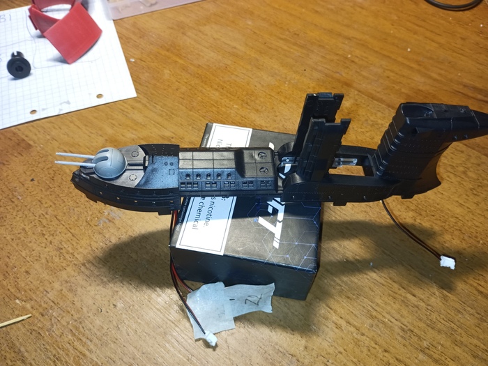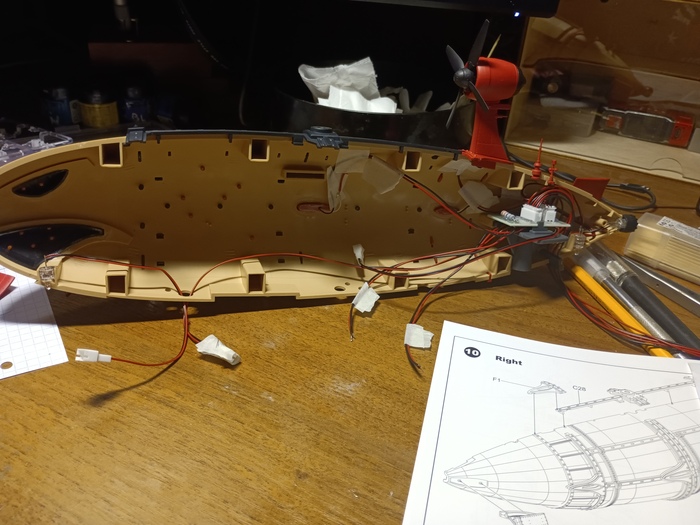 Но когда дело касается электрики(а ее тут много),это тихий ужас.мало того,что разводка непойми как сделана,так и ее схема-это одно чб фото и понять что куда идет ни фига нельзя.собрал все по инструкции-в итоге движки пашут,а свет нет(хз почему,может кз,может все таки напутал где).в итоге электрификации не вышло и вместо коммунизма ток советская власть осталась🤷почему не проверил в разборе?боялся винты поломать,которые уже на моторах стояли.и насчет моторов-провода от них тянутся через крыло,но вкладываются в крыло до сборки,после сборки протянуть оч.сложно,тк канал в крыле кривой(зачем?) и протолкнуть в него провод не получится.на одном крыле попробовал в сборе,по итогу просверлил прямой канал и протянул.на остальных 4х занимался эквилибристикой.Плюс некоторые диодные ноги надо под 90 загибать,и не получить там КЗ-это надо постараться.Плюс провода пришлось наращивать,тк китайцы на них сэкономили