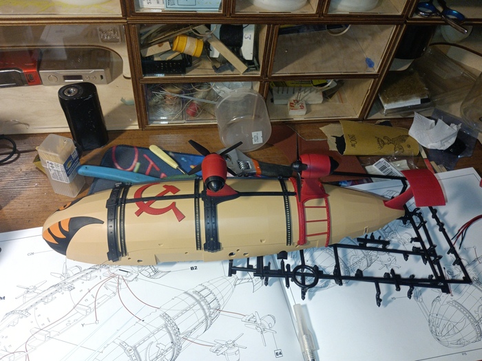 В целом механическая сборка сложности не представляет,если все тщательно зачищать(это не лего-наплывы встречаются).я чуть разворачивал отверстия,тк иногда совсем не заходит.сначала собирается одна половина баллона,потом рубка,потом вторая половина баллона.полтюбика секунды геля и полшприца быстрой эпоксидки(там где туман нежелателен и у проводов).Прожекторы и радар крепил в последнюю очередь на уже собранную модель.Пришлось серьезно подпиливать центральную часть с зубами,которая вставляется после сборки половин баллона.