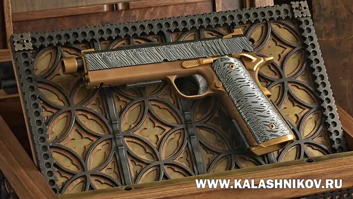 В отделке этого коллекционного пистолета присутствуют готические мотивы, использован дамаски и уникальные текстуры.
