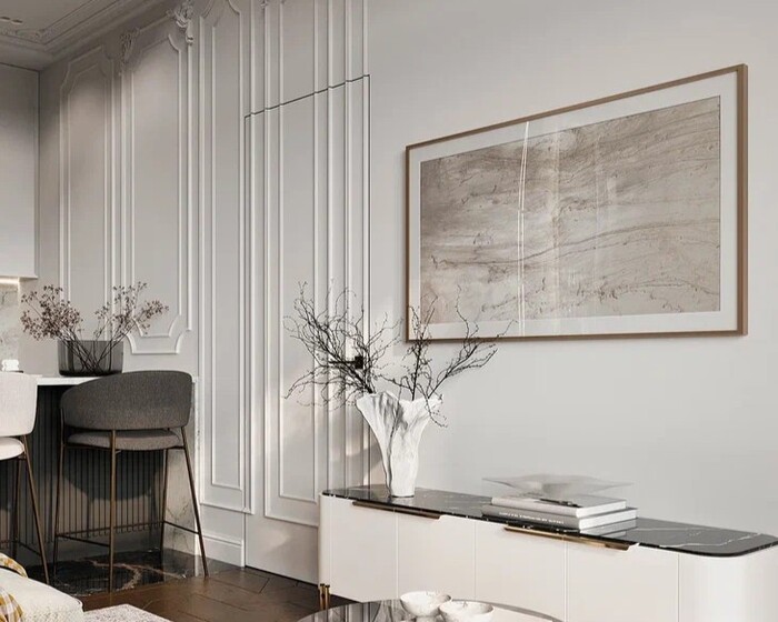 Прихожая встречает светлыми стенами с классическим лепным декором. Скрытые двери под покраску поддерживают чистую геометрию пространства. Тёмный мрамор на полу даёт выразительный контраст и подчёркивает современный характер проекта.